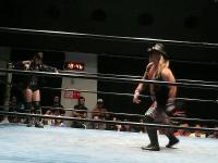 スイングDDT式のアームブリーカーから腕折り狙うも、体勢入れ替えTAKAがジャストフェイスロックに。トウナイは一目散にロープへ向かうも途中で止めら向きを変えられる。ならばと反対方向のロープに逃げるも、また向き変えられカット。