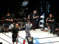 試合後のアピール合戦で、一人だけスーツの棚橋。