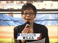 休憩の前に演歌歌手の茜ちよみによる歌謡ショー。そう、茜先生ですよ。紹介によれば、昭和50年!にモデルデビュー後、昭和56年に歌手デビューし、現在に至っているらしい。うーーん、昭和50年っていえば、1975年だよん。27年前っすか。う~みゅ。茜先生のヒット曲に加え、お祭りマンボも歌い、合計4曲を熱唱。なんか無理矢理盛り上がっている感もなきにしもなかったが、場内もいいノリをしてましたよ。あ、ちなみに、お客さんは100人位?もっといたかな?実数発表かな。昭和50年にデビュー・・・ええ、年齢は・・・想像しないでおこう。